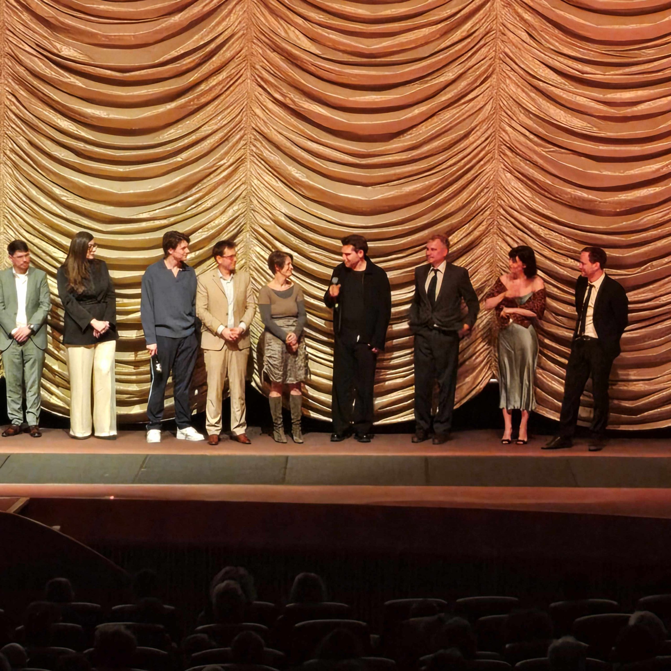 Am Ende gab es nicht enden wollenden Applaus, Moderatorin, Regisseur und Darsteller hatten immer wieder Mühe, das Wort zu bekommen. Unter ihnen: die reale Barbara Pachl-Eberhart! Auf dem Bild neben dem Mann mit Mikro.